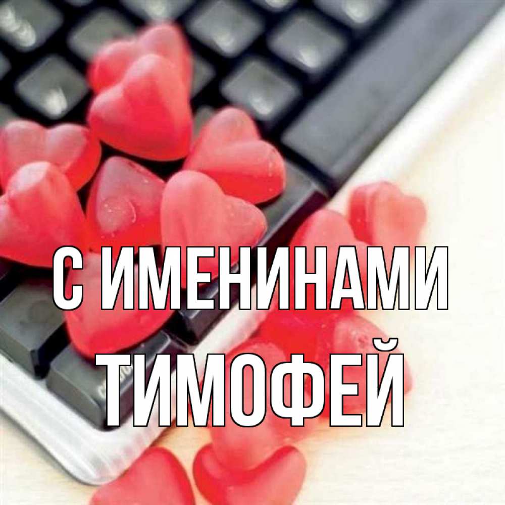Открытка С именинами Тимофей. мармеладки на клавиатуре. конфеты в виде сердец