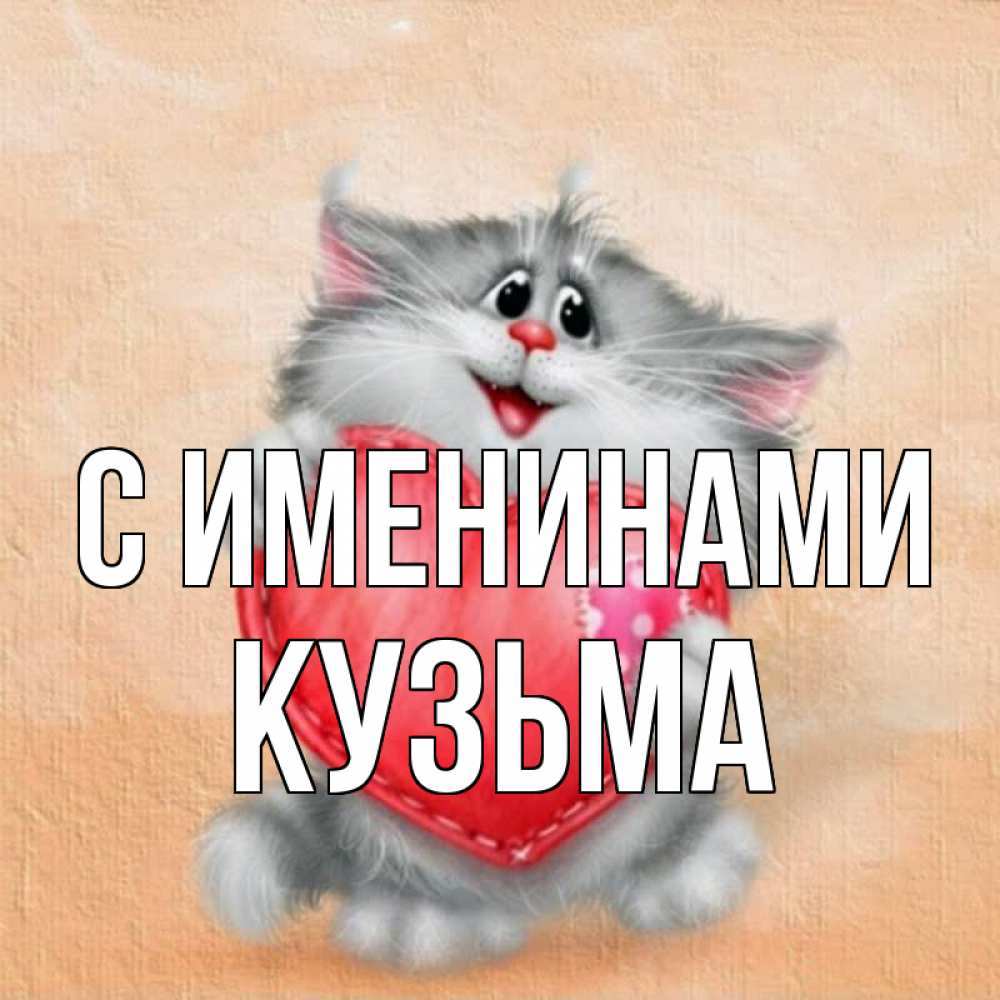Открытка С именинами Кузьма. для тебя пушистое чудо. сердце с заплаткой