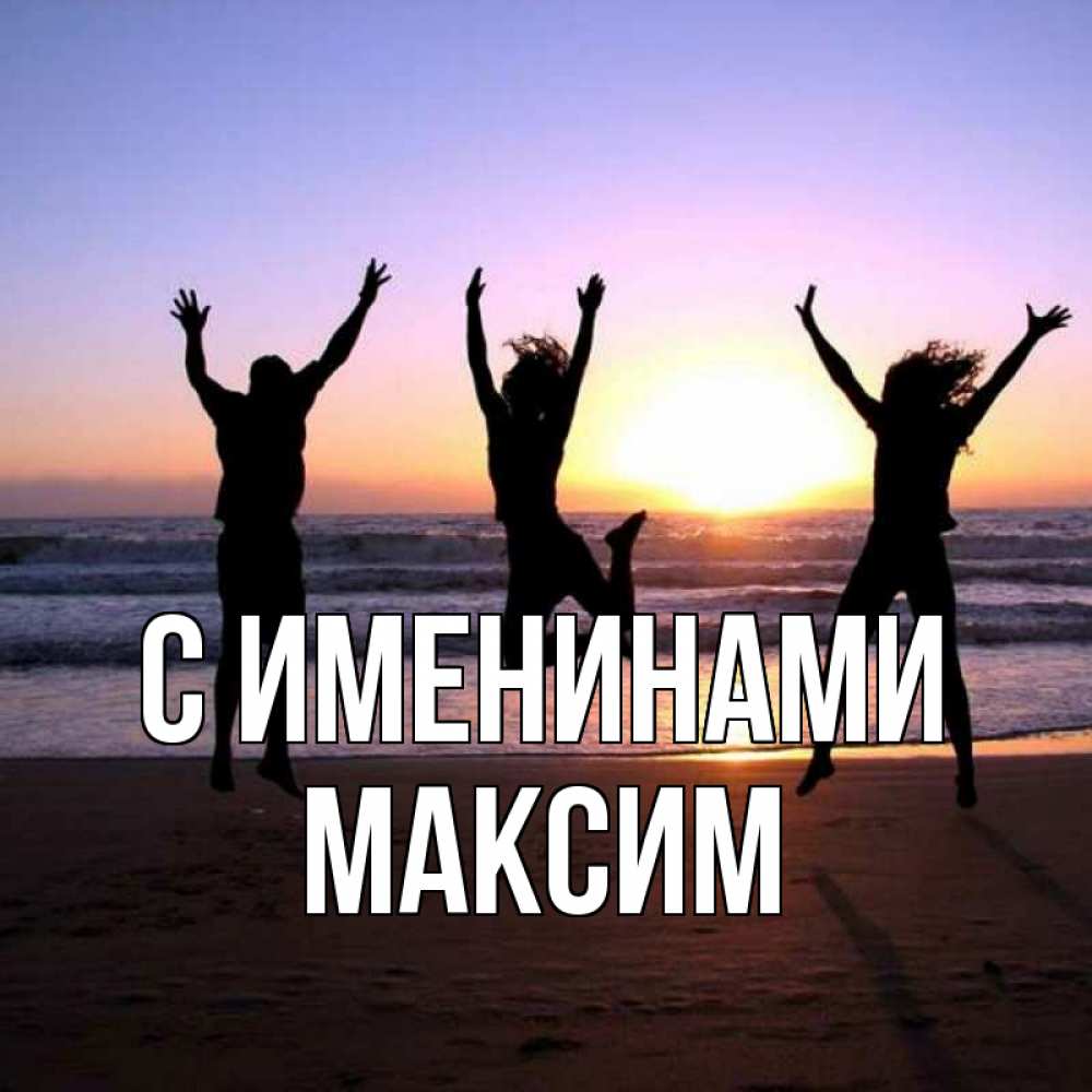 Открытка С именинами Максим. прыгаем на берегу. позитив