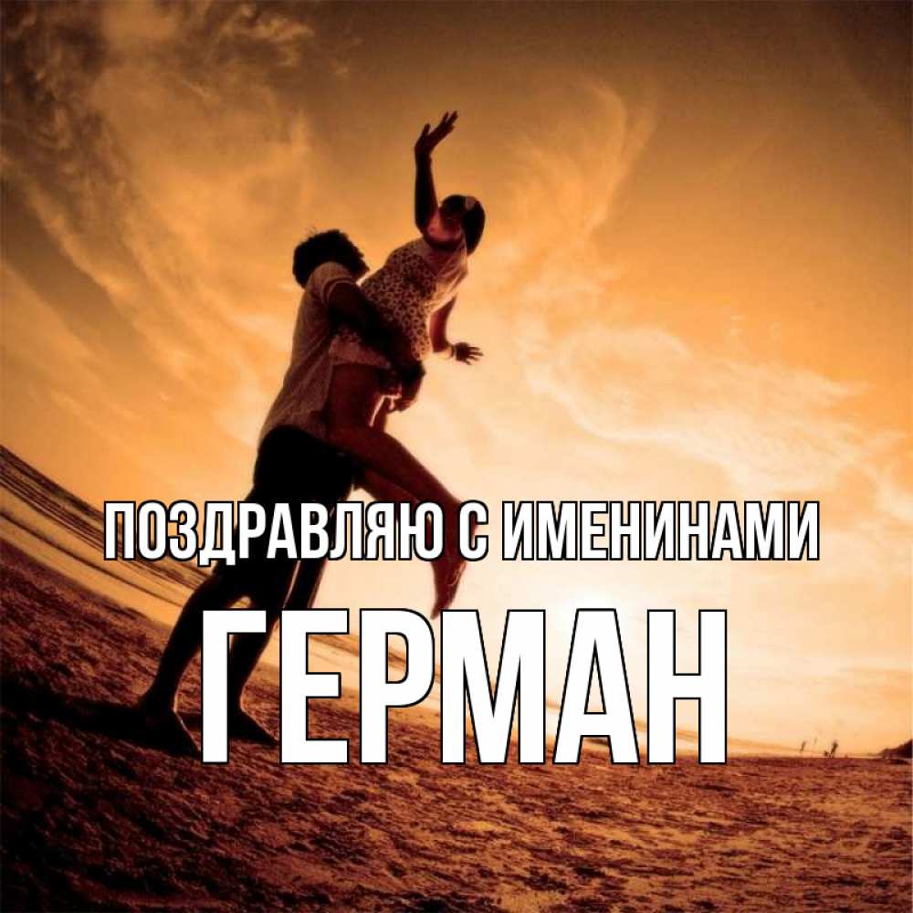 Открытка Поздравляю с именинами Герман. фото с искажениями. парень держит девушку