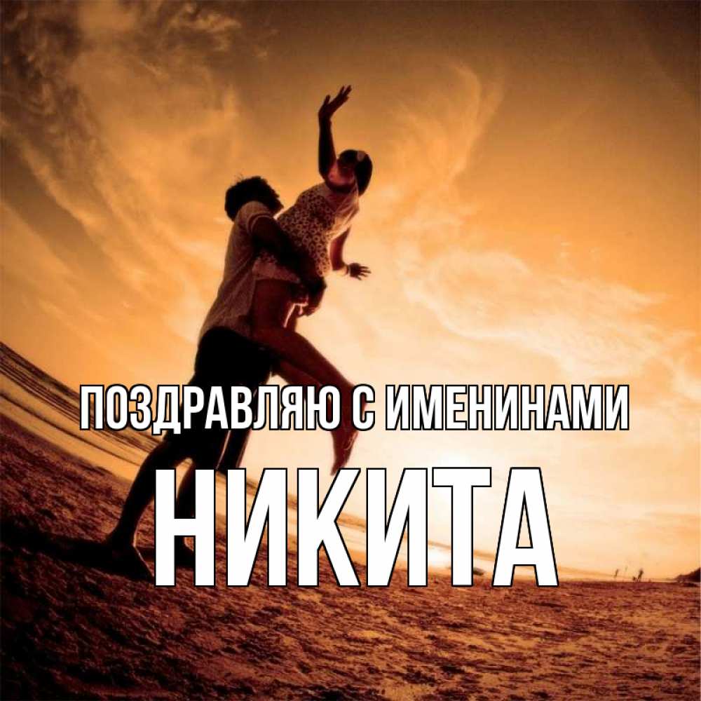 Открытка Поздравляю с именинами Никита. фото с искажениями. парень держит девушку