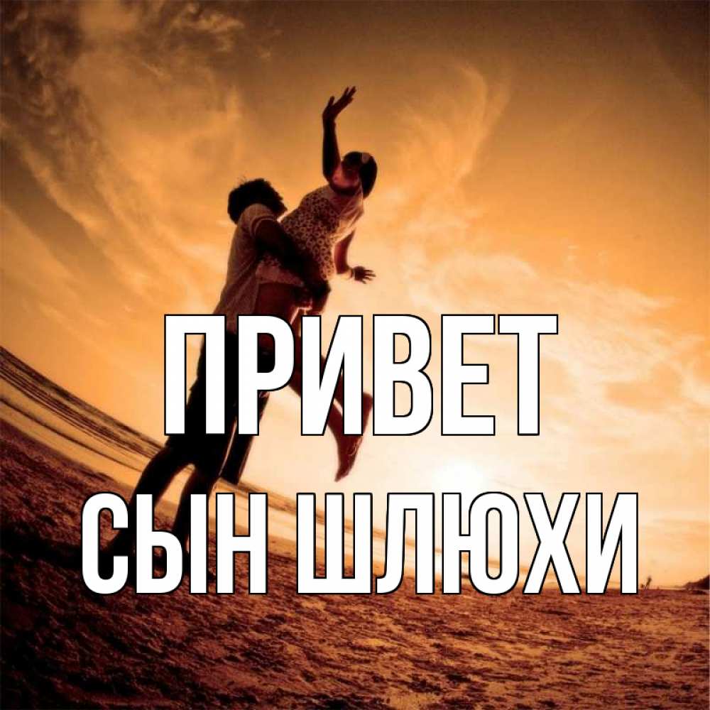 Открытка Привет Сын шлюхи. фото с искажениями. парень держит девушку