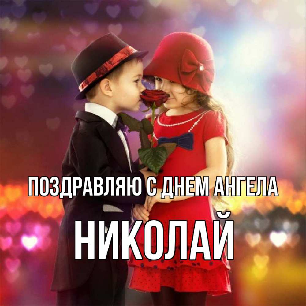 Открытка Поздравляю с днем Ангела Николай. мальчик и девочка. черное и красное и роза