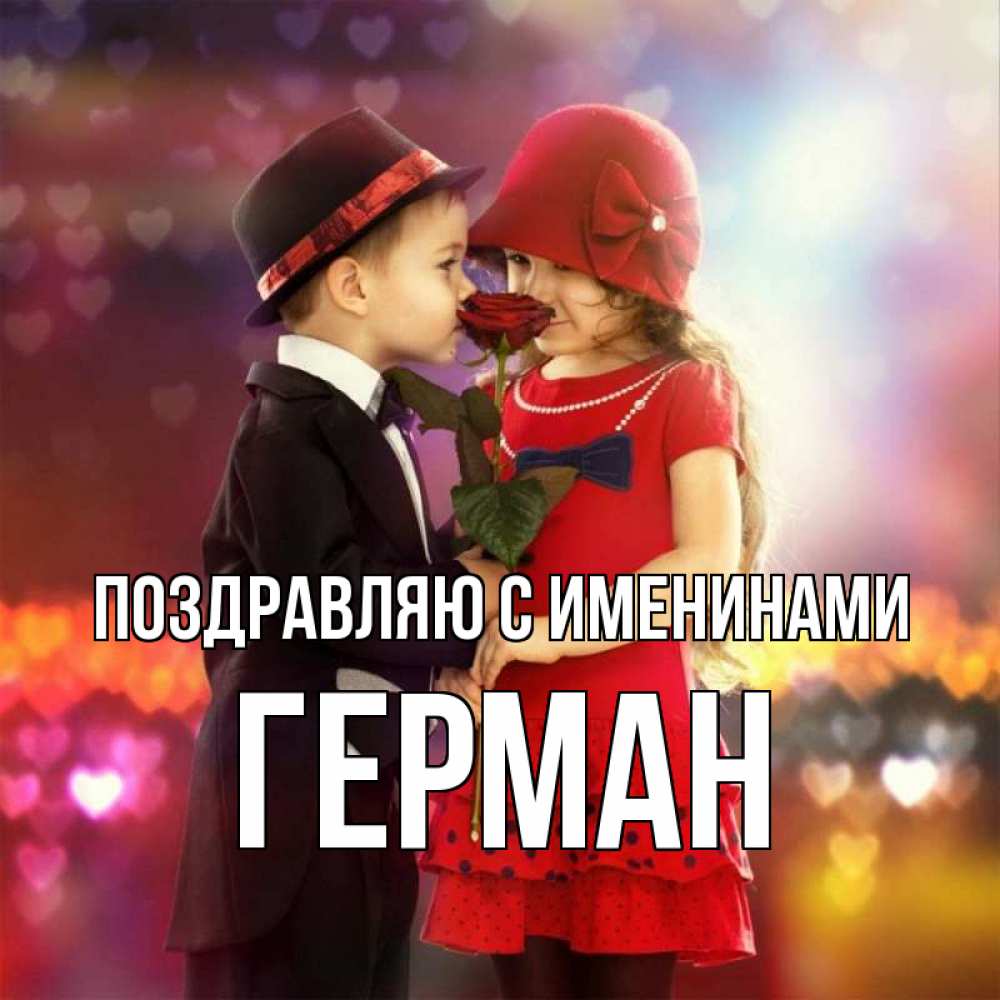 Открытка Поздравляю с именинами Герман. мальчик и девочка. черное и красное и роза