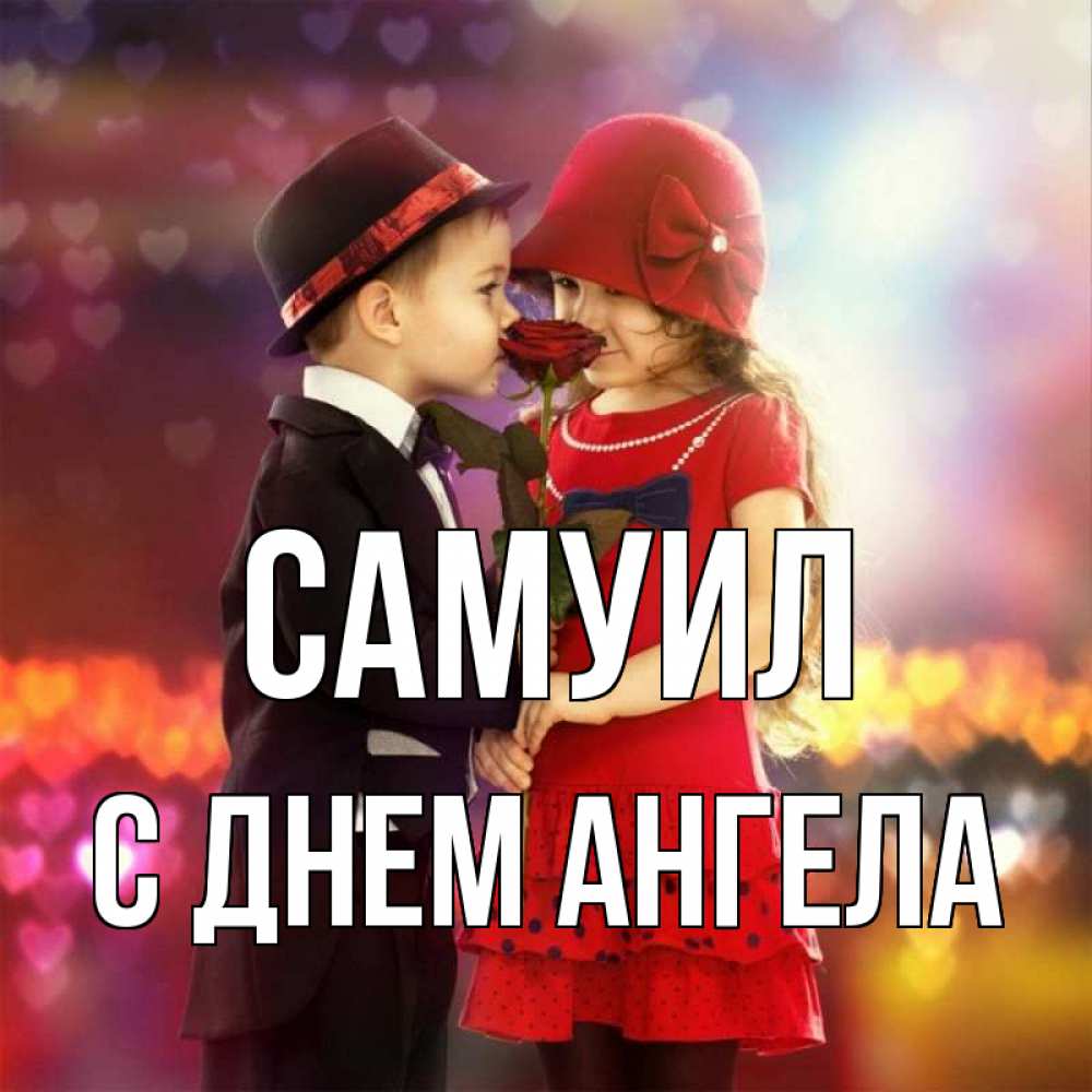 Открытка Самуил С днем ангела. мальчик и девочка. черное и красное и роза