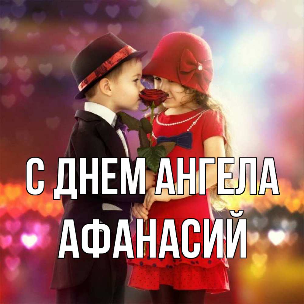 Открытка С днем Ангела Афанасий. мальчик и девочка. черное и красное и роза