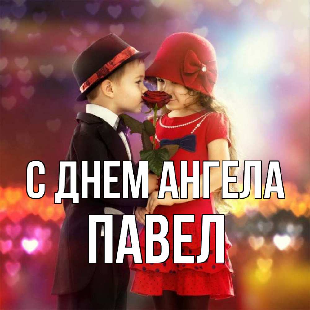 Открытка С днем Ангела Павел. мальчик и девочка. черное и красное и роза