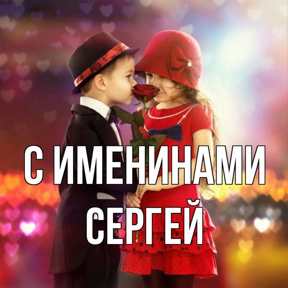 Открытка С именинами Сергей. мальчик и девочка. черное и красное и роза