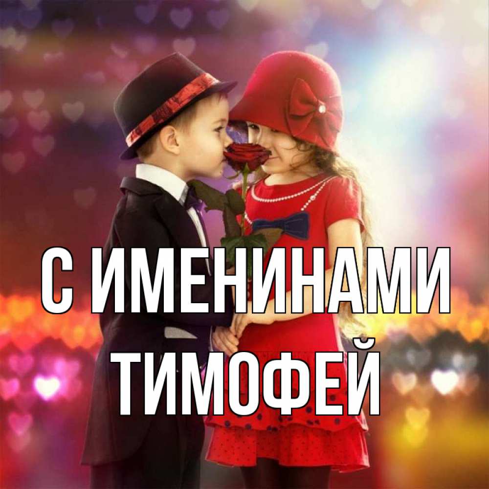 Открытка С именинами Тимофей. мальчик и девочка. черное и красное и роза