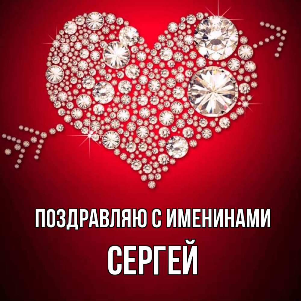 Открытка Поздравляю с именинами Сергей. сердце с бриллиантом. стрела купидона