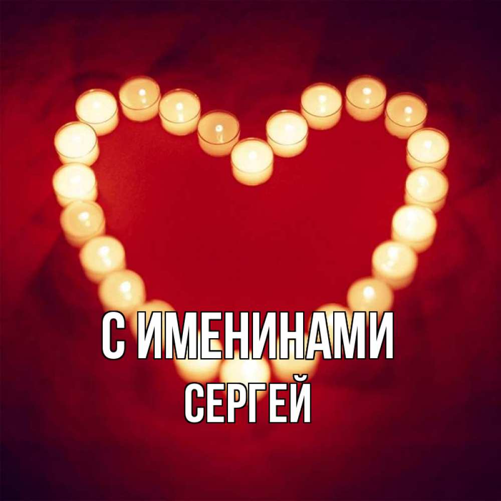 Открытка С именинами Сергей. свечки в форме сердца. красота на красном фоне