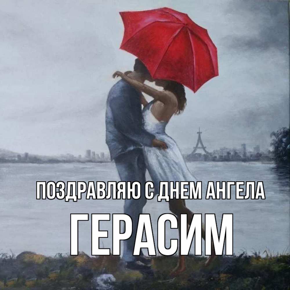 Открытка Поздравляю с днем Ангела Герасим. поцелуй. под красным зонтом