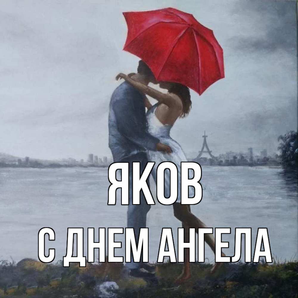 Открытка Яков С днем ангела. поцелуй. под красным зонтом