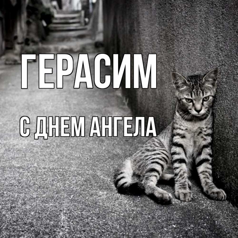 Открытка Герасим С днем ангела. полосатый котик скучает один. одиноко котику