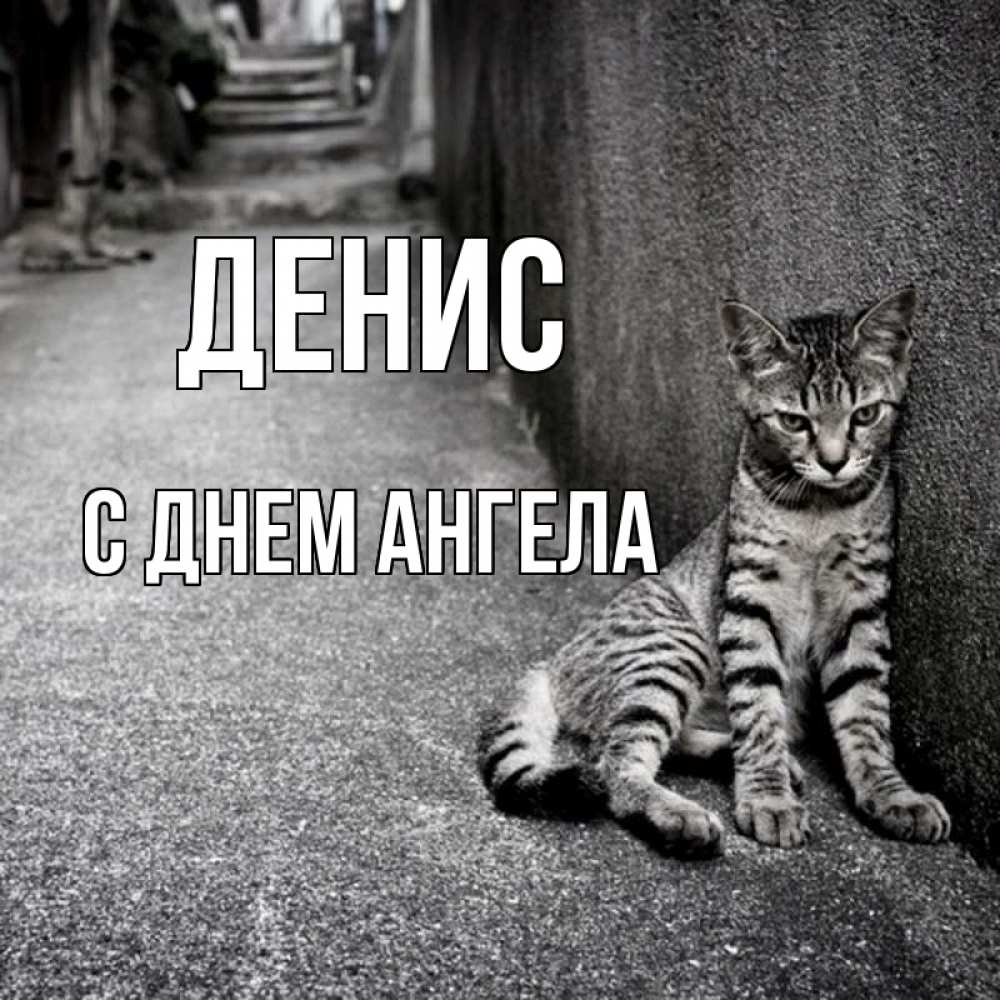 Открытка Денис С днем ангела. полосатый котик скучает один. одиноко котику