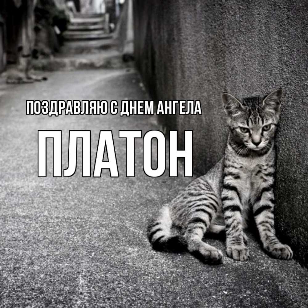 Открытка Поздравляю с днем Ангела Платон. полосатый котик скучает один. одиноко котику