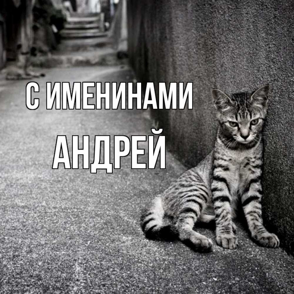 Открытка С именинами Андрей. полосатый котик скучает один. одиноко котику
