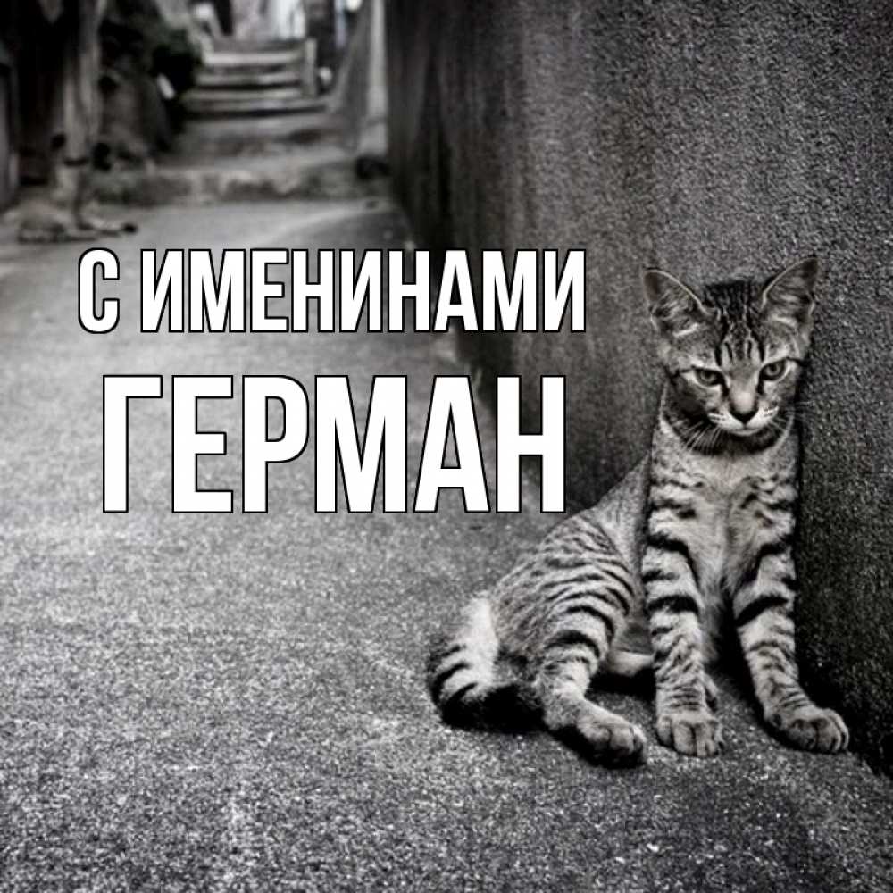 Открытка С именинами Герман. полосатый котик скучает один. одиноко котику