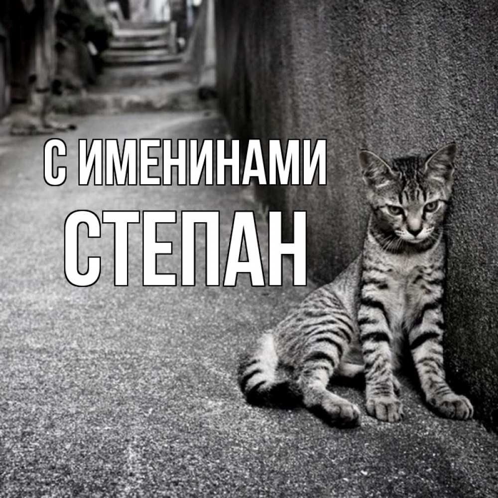 Открытка С именинами Степан. полосатый котик скучает один. одиноко котику