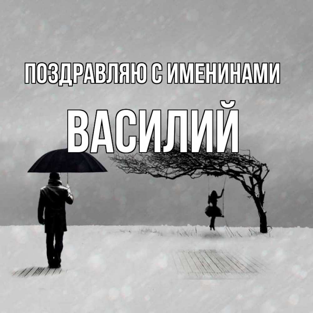 Открытка Поздравляю с именинами Василий. девочка на качеле. мужчина с зонтом