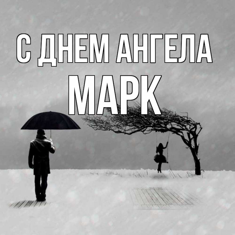 Открытка С днем Ангела Марк. девочка на качеле. мужчина с зонтом
