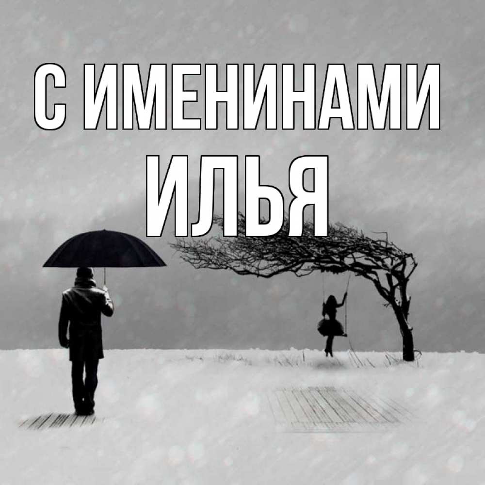 Открытка С именинами Илья. девочка на качеле. мужчина с зонтом