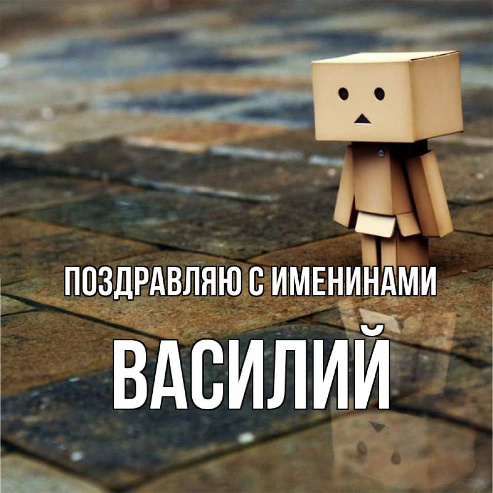 Открытка Поздравляю с именинами Василий. майнкрафтик скучает. куколка из картона в стиле майнкрафт