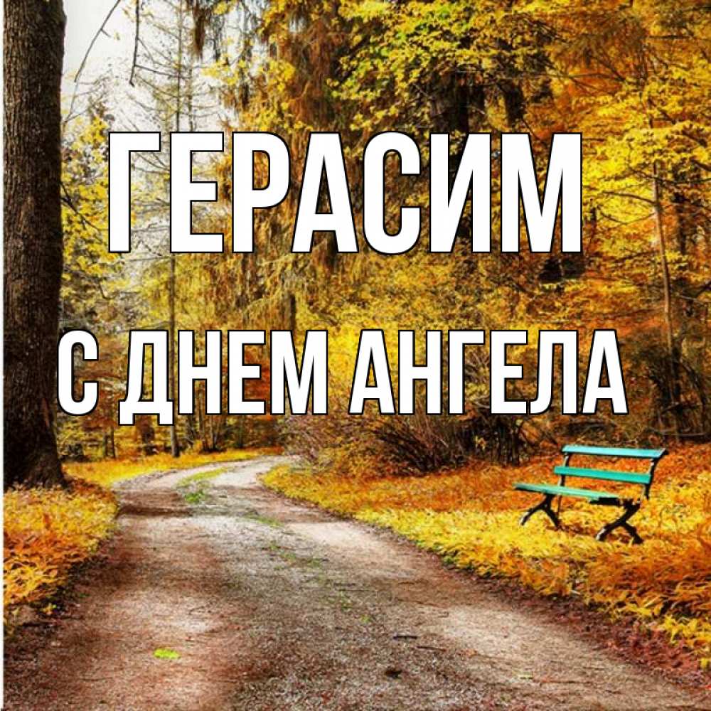Открытка Герасим С днем ангела. осенняя пустая трапинка. зеленая лавочка и осенний лес