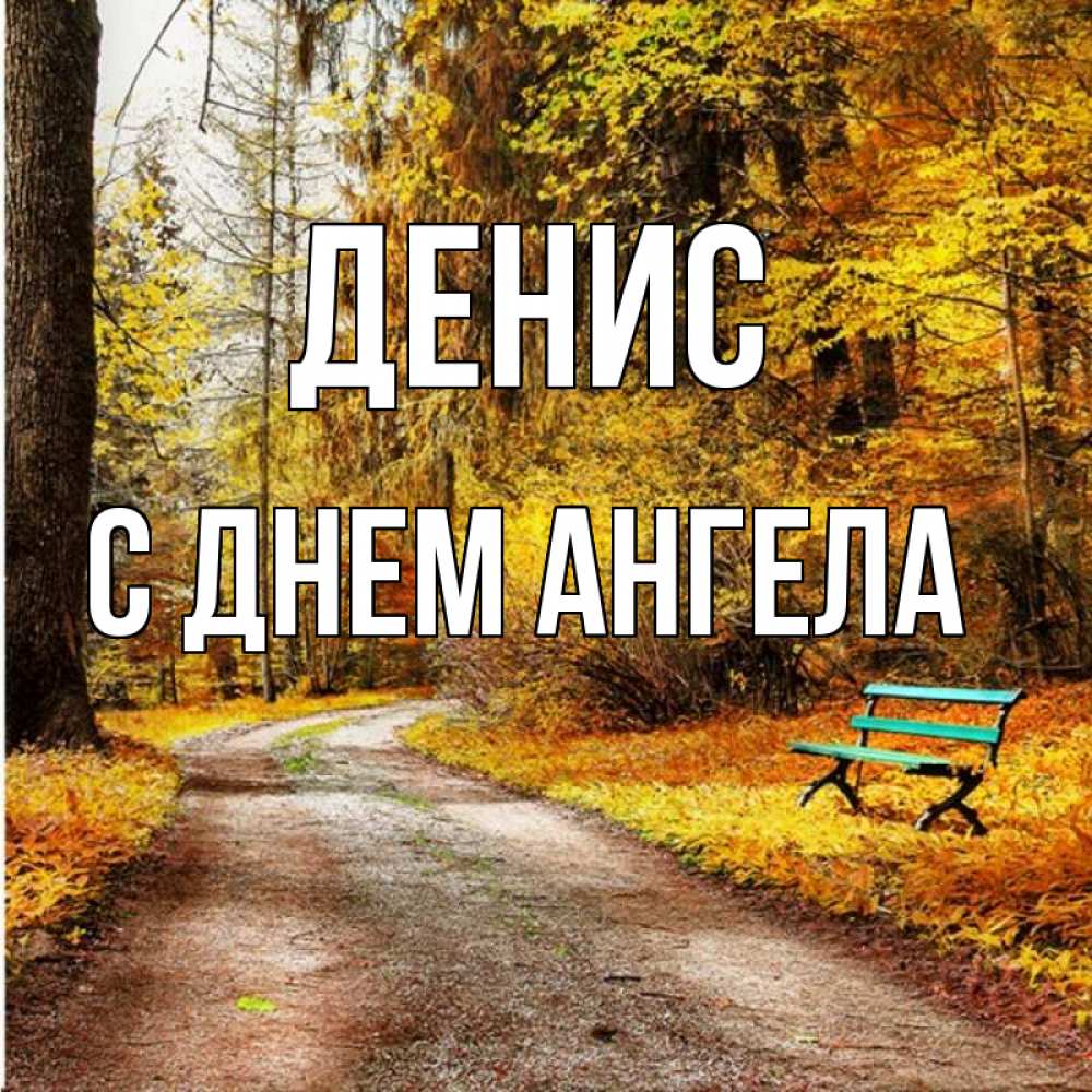 Открытка Денис С днем ангела. осенняя пустая трапинка. зеленая лавочка и осенний лес