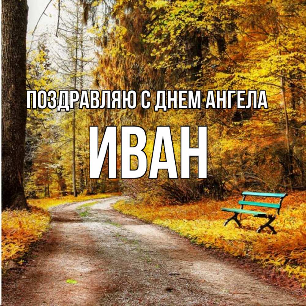 Открытка Поздравляю с днем Ангела Иван. осенняя пустая трапинка. зеленая лавочка и осенний лес