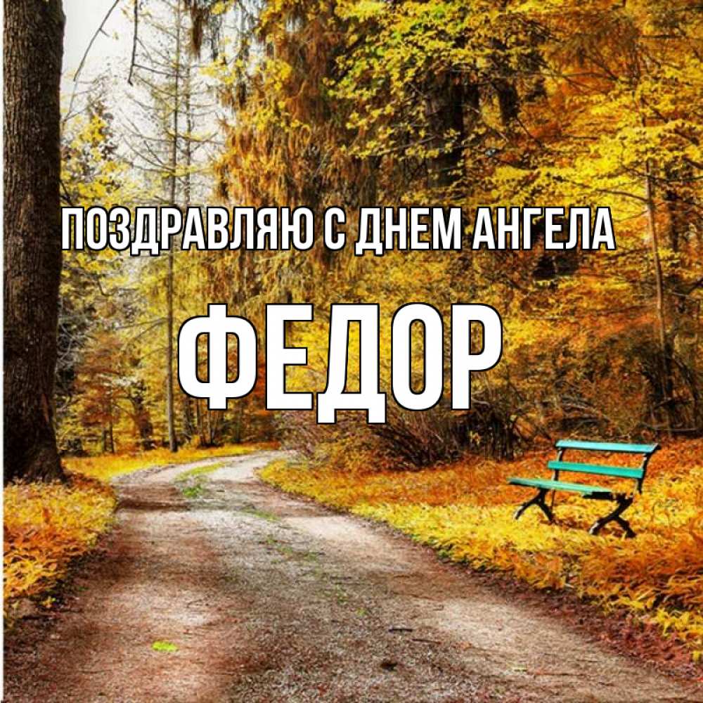 Открытка Поздравляю с днем Ангела Федор. осенняя пустая трапинка. зеленая лавочка и осенний лес
