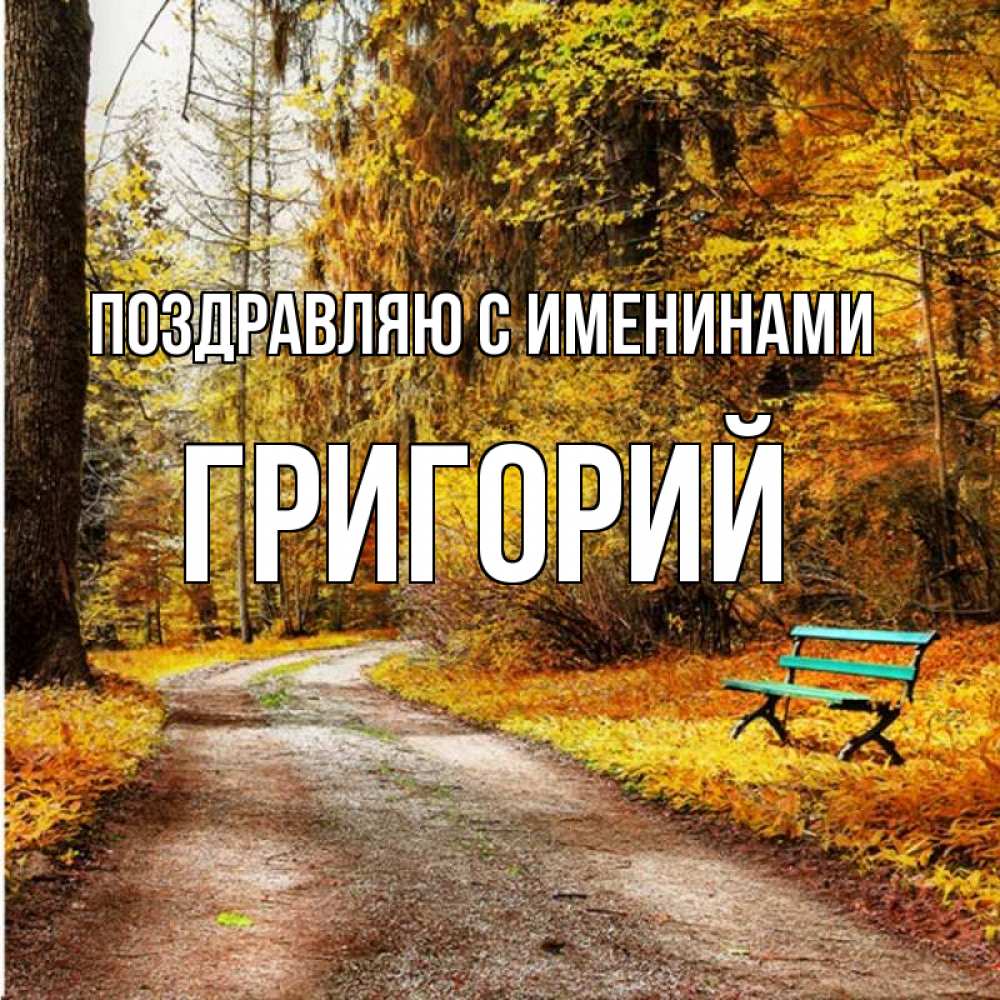 Открытка Поздравляю с именинами Григорий. осенняя пустая трапинка. зеленая лавочка и осенний лес