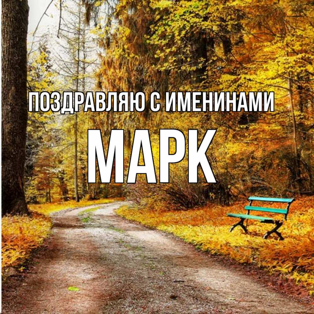 Открытка Поздравляю с именинами Марк. осенняя пустая трапинка. зеленая лавочка и осенний лес