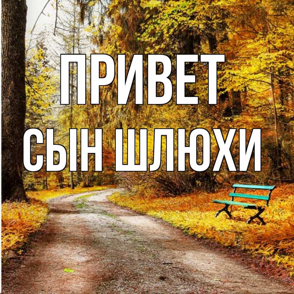 Открытка Привет Сын шлюхи. осенняя пустая трапинка. зеленая лавочка и осенний лес