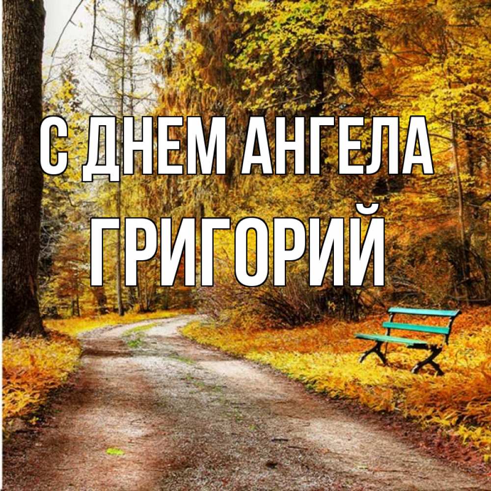 Открытка С днем Ангела Григорий. осенняя пустая трапинка. зеленая лавочка и осенний лес