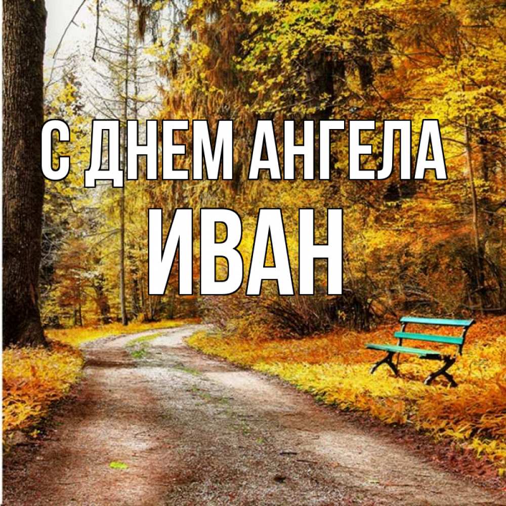 Открытка С днем Ангела Иван. осенняя пустая трапинка. зеленая лавочка и осенний лес