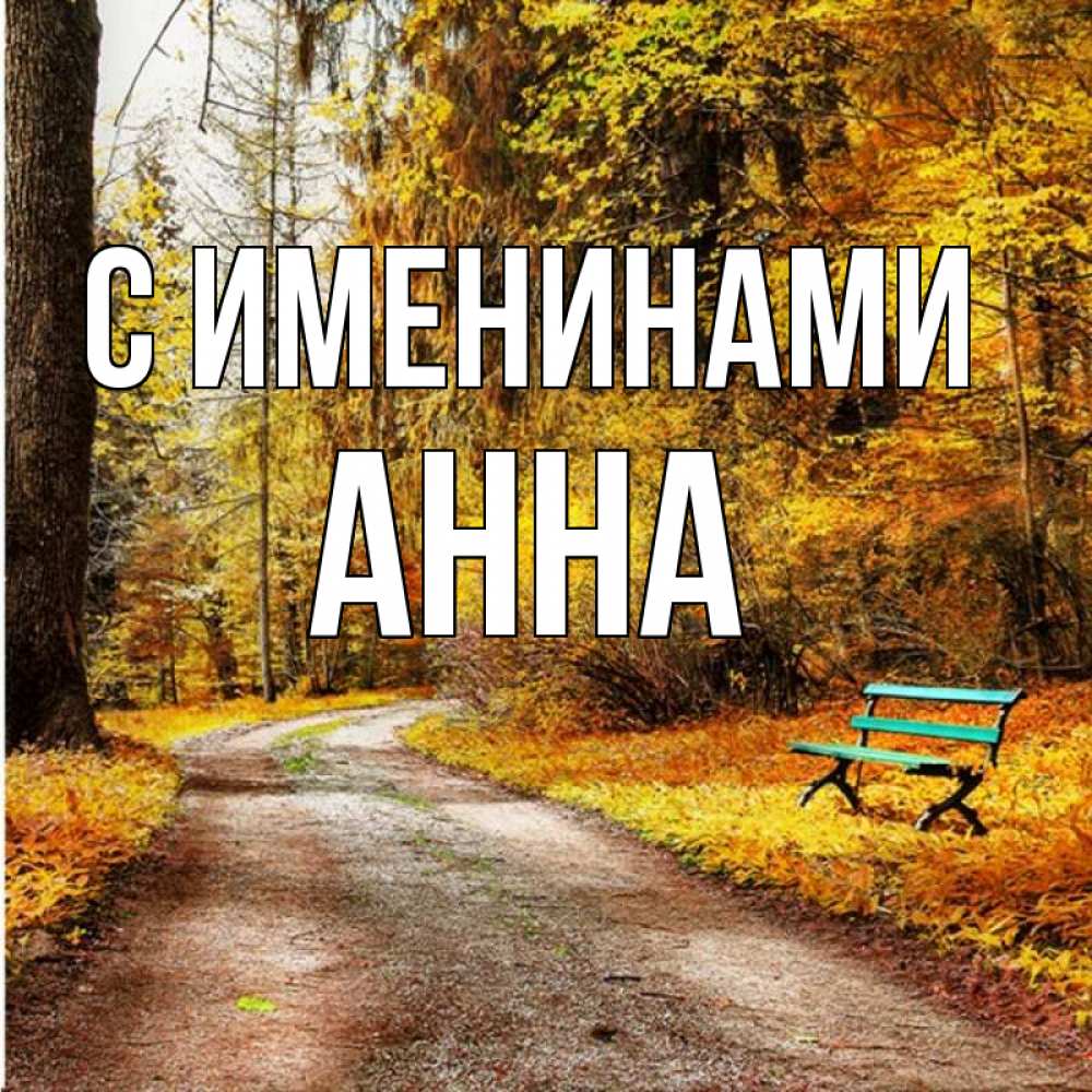 Открытка С именинами Анна. осенняя пустая трапинка. зеленая лавочка и осенний лес