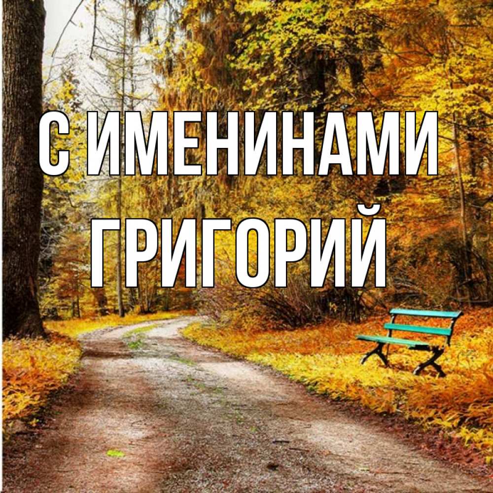 Открытка С именинами Григорий. осенняя пустая трапинка. зеленая лавочка и осенний лес