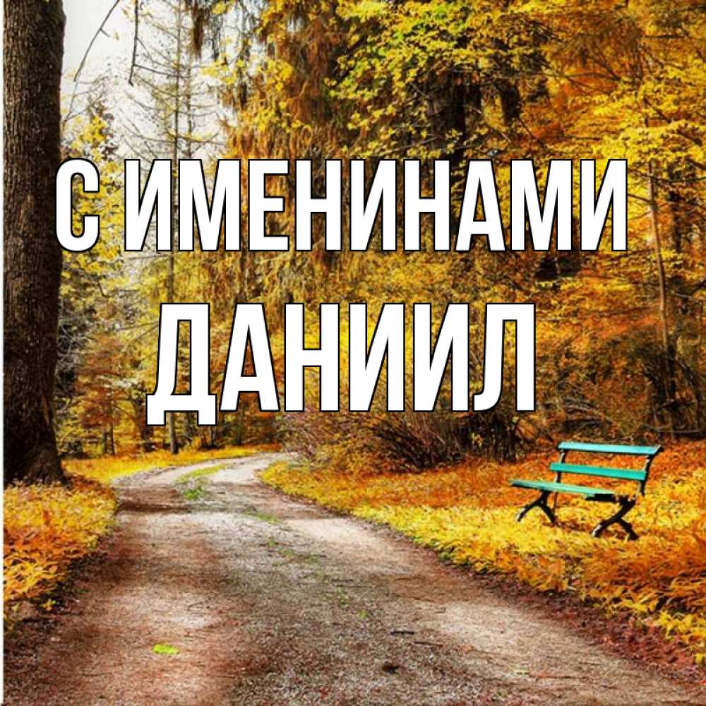 Открытка С именинами Даниил. осенняя пустая трапинка. зеленая лавочка и осенний лес