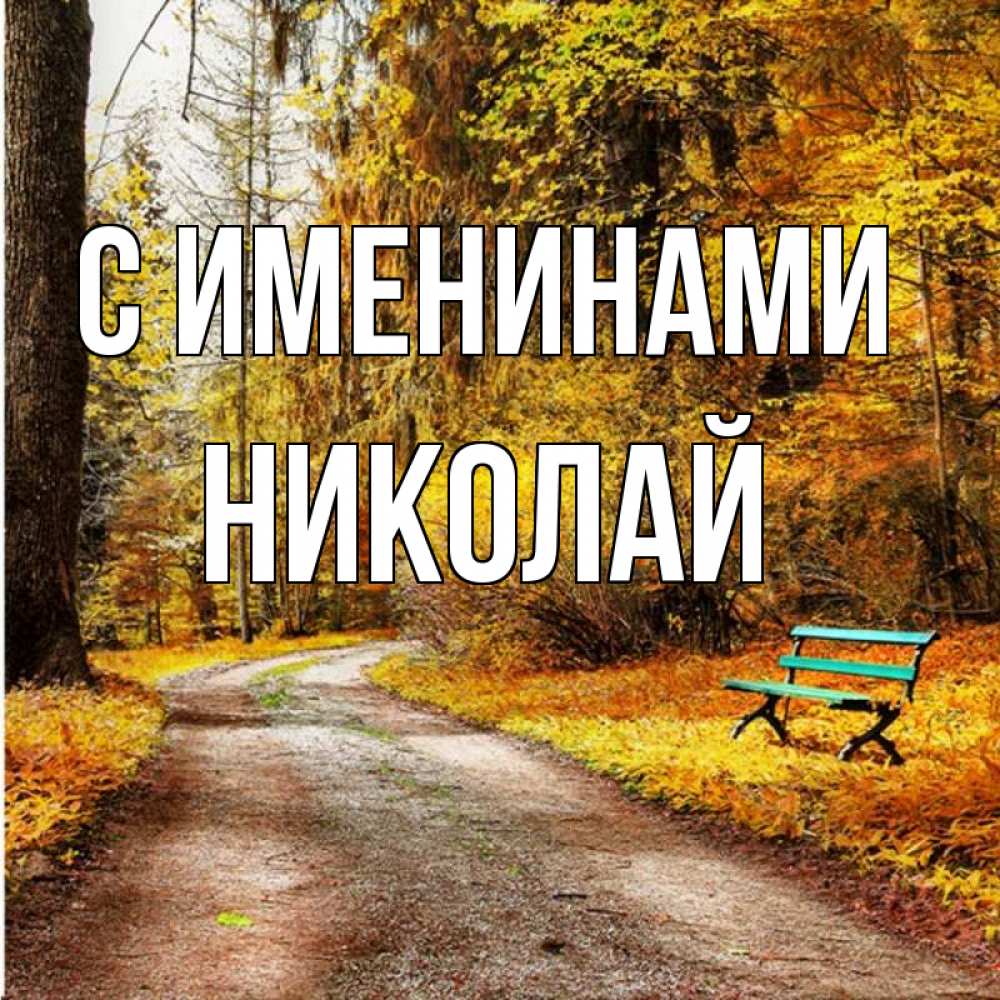 Открытка С именинами Николай. осенняя пустая трапинка. зеленая лавочка и осенний лес