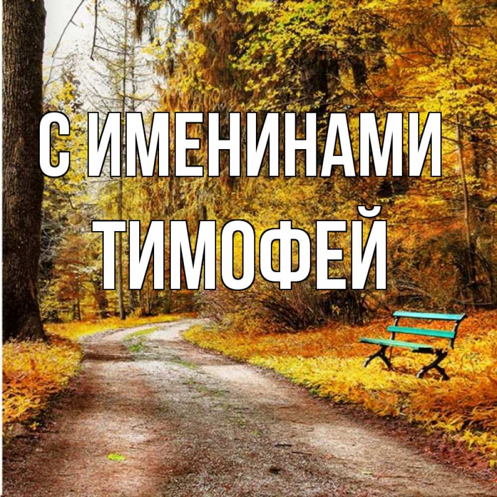 Открытка С именинами Тимофей. осенняя пустая трапинка. зеленая лавочка и осенний лес