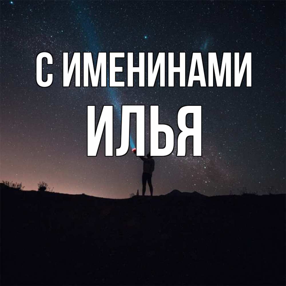 Открытка С именинами Илья. я тебя ищу в небе. звезды и луч света