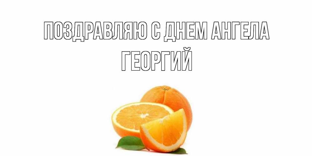 Открытка Поздравляю с днем Ангела Георгий. мандарин нарезан на дольки с зеленым листом. мандарин