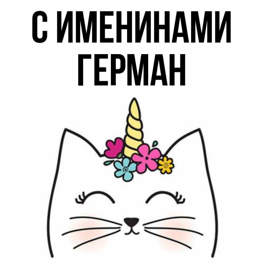 Открытка С именинами Герман. Котик с рогом. милый кот с одним рожком