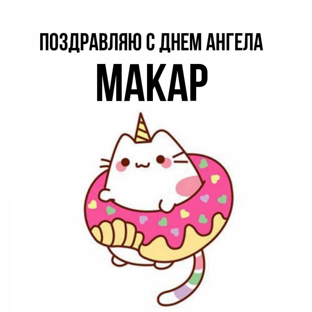 Открытка Поздравляю с днем Ангела Макар. утречко. кот в бублике