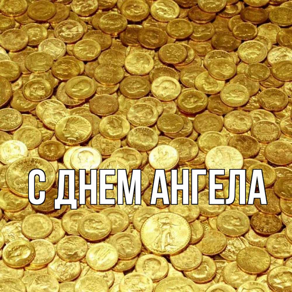 Открытка С днем ангела. с золотыми монетами. с пожеланием разбогатеть С днем рождения