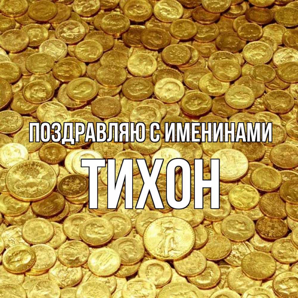 Открытка Поздравляю с именинами Тихон. с золотыми монетами. с пожеланием разбогатеть
