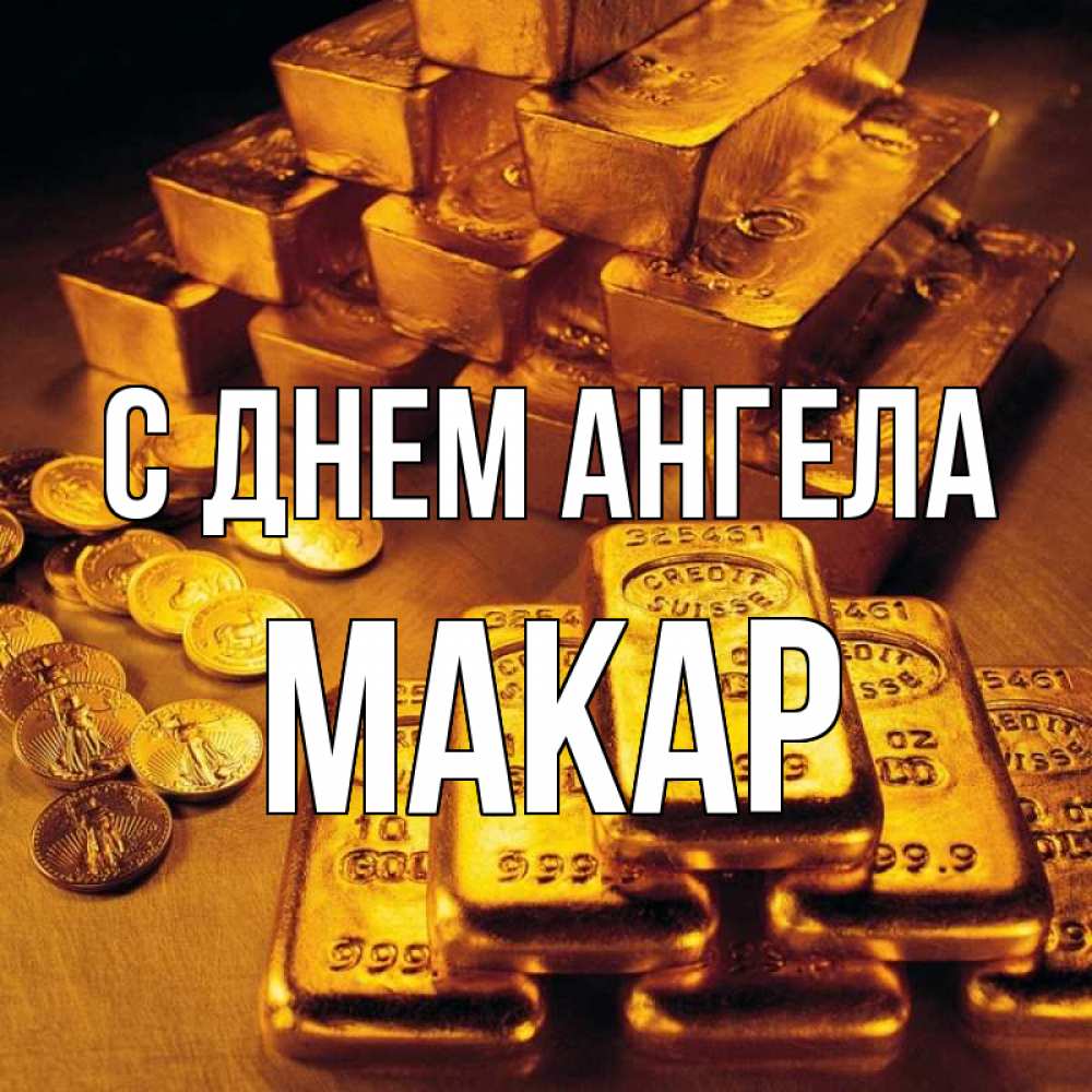 Открытка С днем Ангела Макар. с золотом . со слитками золота и золотыми монетами