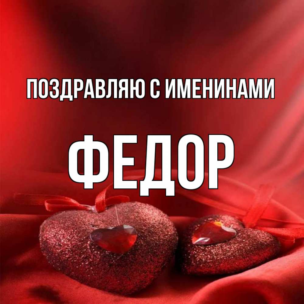 Открытка Поздравляю с именинами Федор. Красивые сердечки на красной ткане. с лентами