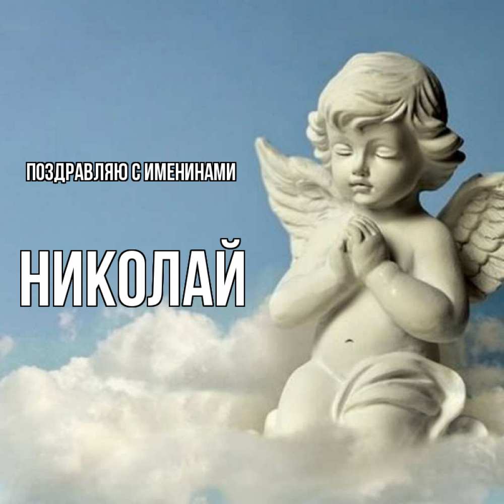 Открытка Поздравляю с именинами Николай. маленький ангел молится. скульптура ангела на небе
